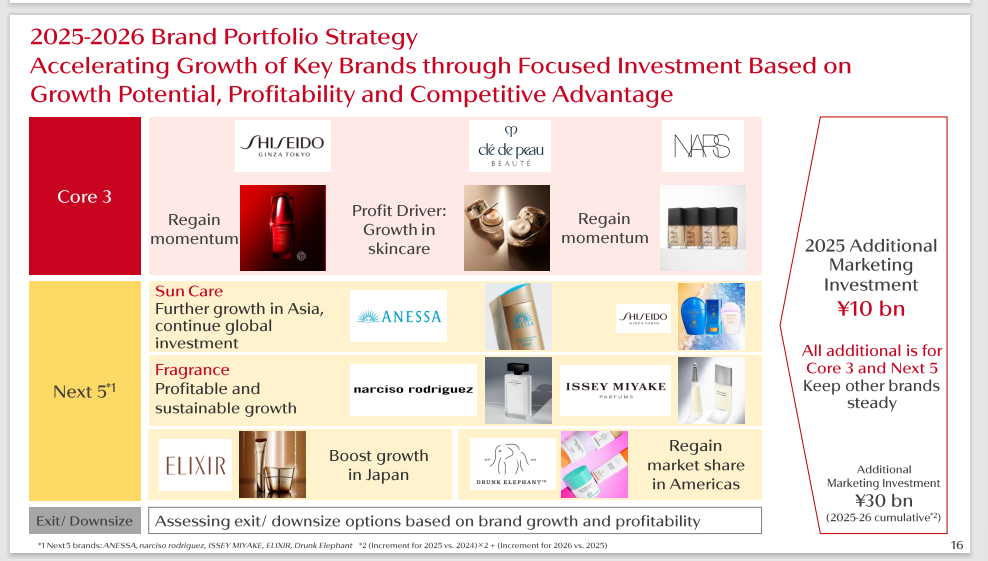 而资生堂则是制定“Core3”品牌与“Next5"品牌,以及跨品牌、地区合作模式等策略。其中,Core3”品牌为资生堂、CPB与NARS,计划重拾势头。