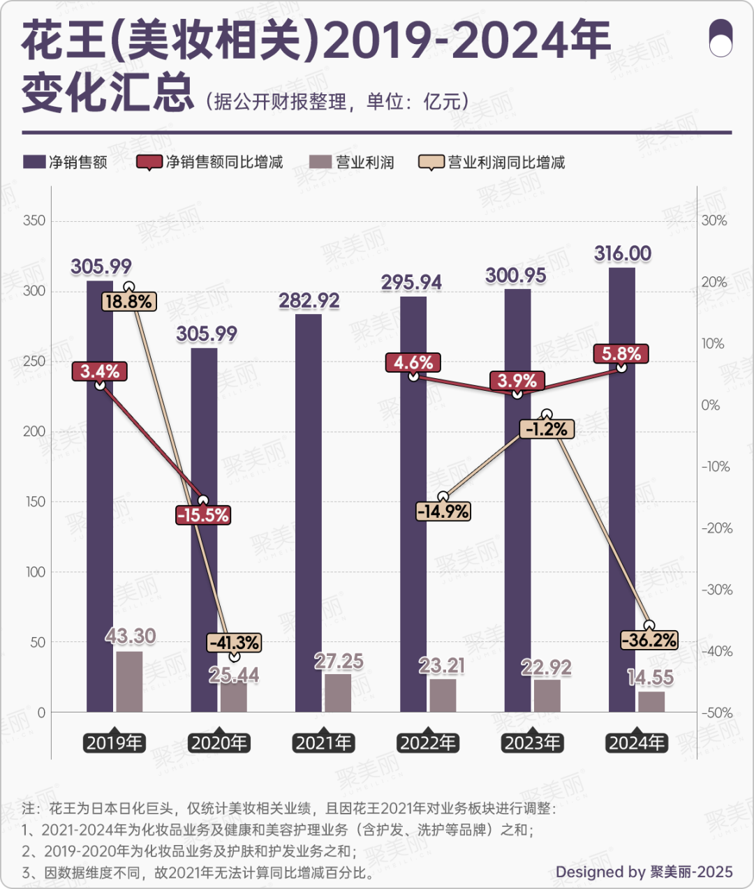 结合上述数据来看,花王美妆相关的两大业务均呈现净销售额增长,但利润出现亏损或是下滑,其2024年净利润累计约14.55亿人民币,为近四年(2021-2024年)中最低值。