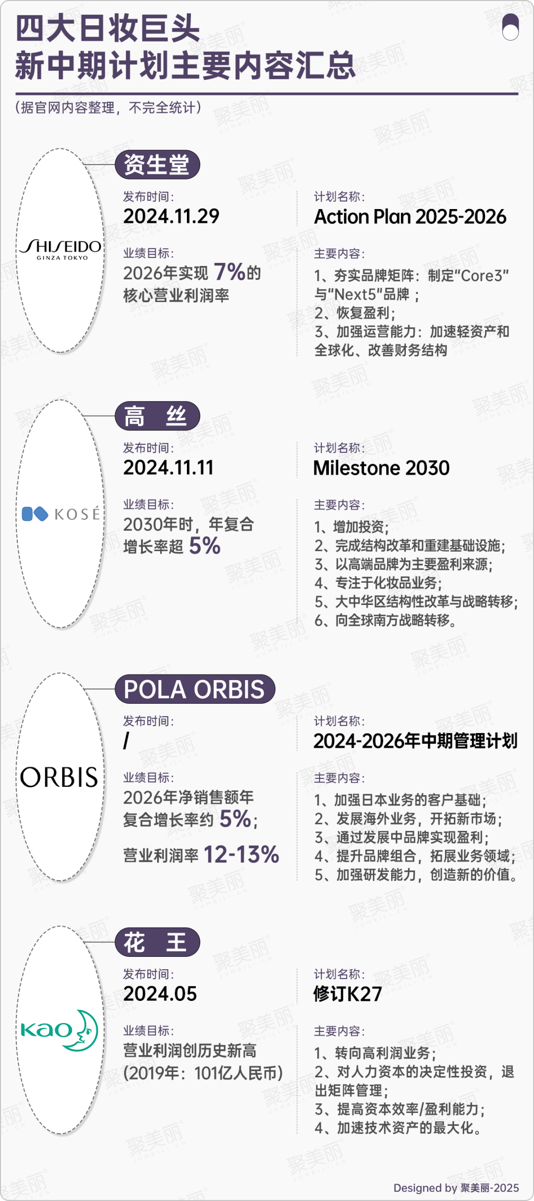 从上图各大日妆企业的中期计划中不难发现,优化品牌资产尤为重要的一大举措,如聚焦化妆品业务的新增量。