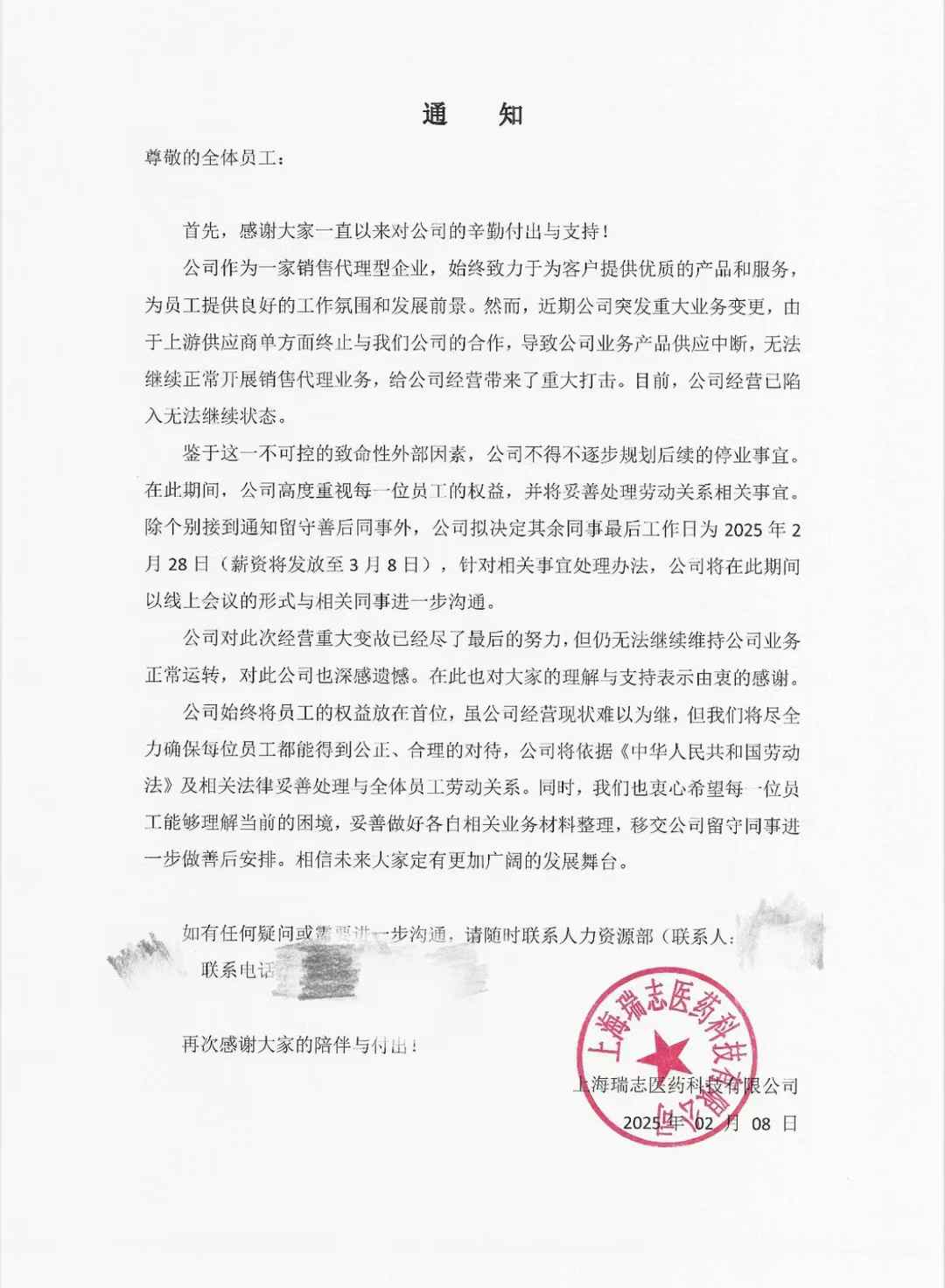 2月8日的对内公告显示,瑞志公司由于上游供应商单方面终止合作,导致产品供应中断,无法继续正常开展销售代理业务,正逐步规划停业事宜,并通知大部分员工最后工作日为2025年2月28日。