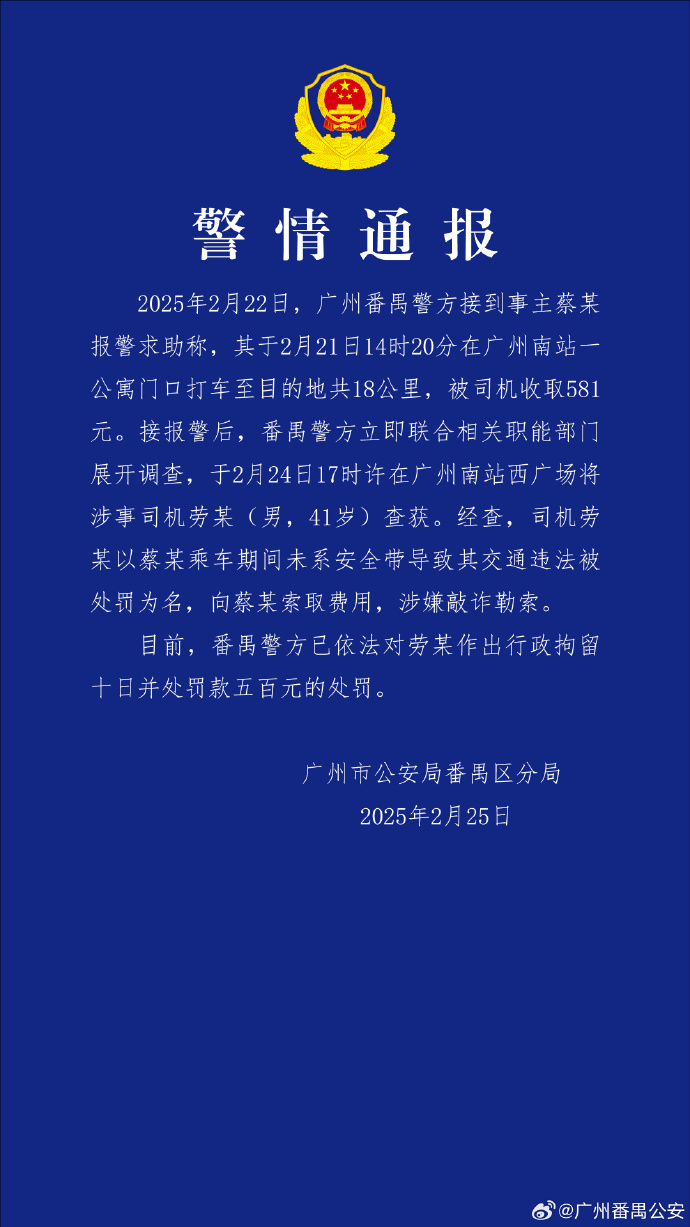 2月25日,广州市公安局番禺区分局发布警情通报称,2月22日,广州番禺警方接到事主蔡某报警求助称,其于2月21日14时20分在广州南站一公寓门口打车至目的地共18公里,被司机收取581元。接报警后,番禺警方立即联合相关职能部门展开调查,于2月24日17时许在广州南站西广场将涉事司机劳某(男,41岁)查获。经查,司机劳某以蔡某乘车期间未系安全带导致其交通违法被处罚为名,向蔡某索取费用,涉嫌敲诈勒索。目前,番禺警方已依法对劳某作出行政拘留十日并处罚款五百元的处罚。