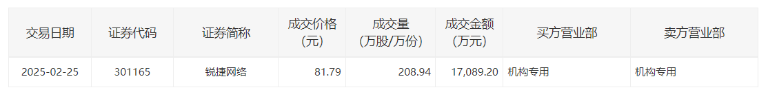 锐捷网络2月25日大宗交易成交208.94万股,成交额1.71亿元,占当日总成交额的10.65%,成交价81.79元,较市场收盘价83.45元折价1.99%。