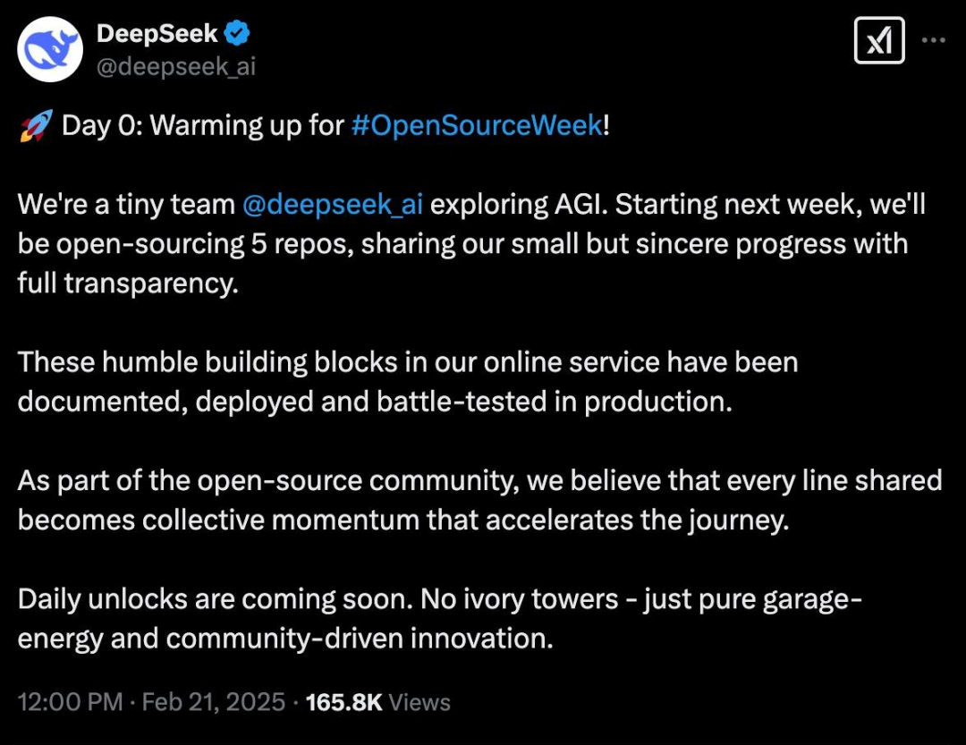 不久前,DeepSeek官方社交媒体再次宣布,将在下周陆续开放自己的最新进展,完全拥抱社区化。