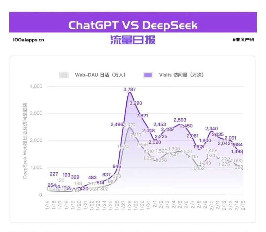 按照第三方机构非凡产研的数据,2025年2月15日,DeepSeek App端日活用户为3761万,相较半个月前的峰值下滑了10%左右。
