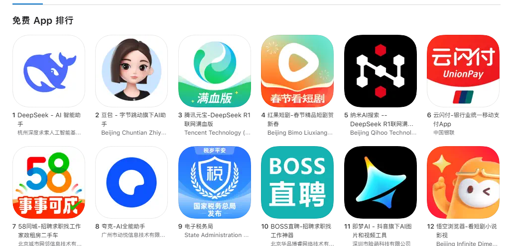 在国区App Store的免费应用下载榜上,DeepSeek虽然仍然排在了第一位,但背后的竞争对手已经形成为“围剿”之势,他们纷纷宣布搭载了DeepSeek模型,威胁着DeepSeek这一“正牌”产品。