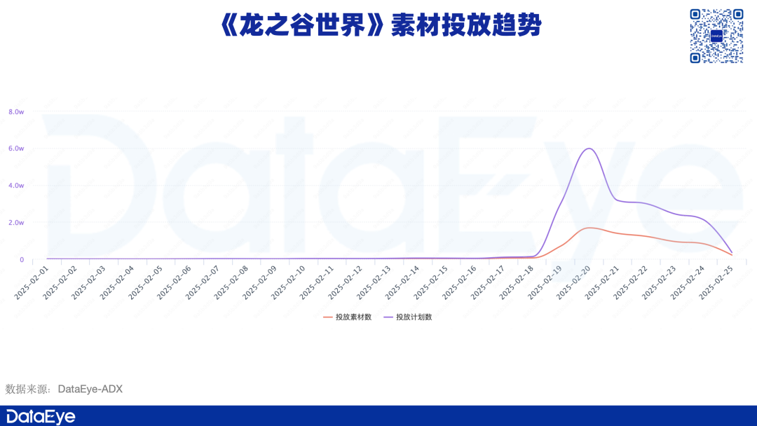 DataEye-ADX数据显示,早在2024年12月初,《龙之谷世界》就开始投放测试素材。不过,较大规模素材出现在今年2月中旬,且是在上线前一天开始进行较多的资源倾斜。从单日数百组的素材投放量升至超7000组投放,而在上天当天迎来投放巅峰,单日投放量超16000组。但自此之后,素材投放量呈直线下滑的趋势。