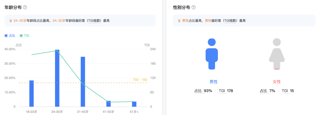 从抖音用户画像来看,青年男性玩家为主。巨量算数数据显示,关键词“龙之谷世界”用户分布明显,其中24-30岁用户占比约为39.6%,而31-40岁的用户占比大约为34.53%。性别分布数据显示,男性玩家占比为93%。