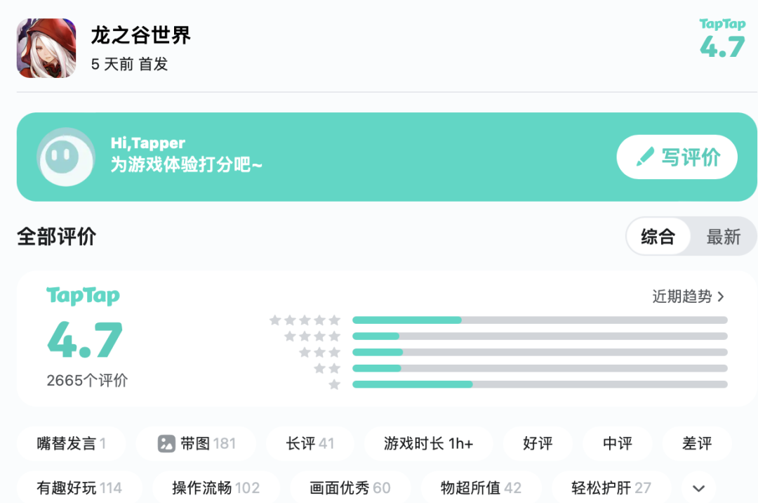 玩家反馈方面,截止至2月25日,《龙之谷世界》在TapTap平台为4.7分,玩家总评论数为2665条。
