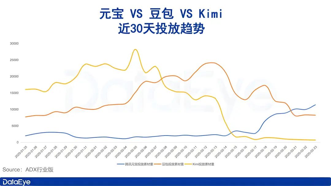 ADX数据显示,2月5日之前,Kimi、豆包与腾讯元宝投放素材量分层明显,且存在不小差距。而后,Kimi投放素材量逐步滑落,并在2月15日左右成为三者中最低,至今始终保持着日素材量不超1000组的力度。
