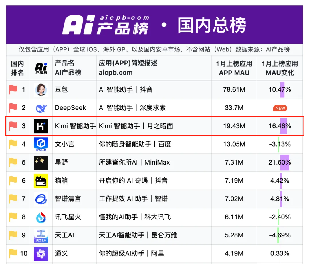 但时至2025年1月,Kimi的月活下降至约1900万。显然,在DeepSeek的超级AI应用叙事之下,Kimi用户流失很难止血。