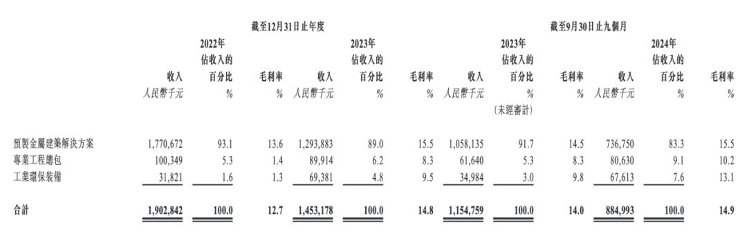 2022年、2023年和2024年前三季度(以下简称“报告期”),该公司的预制金属建筑解决方案业务营收分别为17.71亿元、12.94亿元和7.37亿元,占比分别为93.1%、89%和83.3%,为公司贡献了大部分收入。