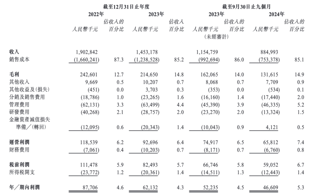 报告期内,该公司的总营收分别为19.03亿元、14.53亿元和8.85亿元。其中,2023年和2024年前三季度的营收同比分别下降了约23.65%和23.38%。