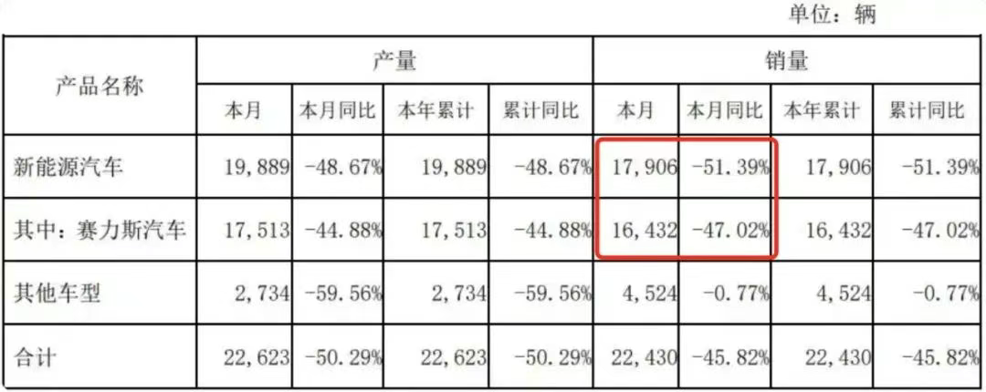 根据赛力斯集团官方公布的数据,2025年1月,赛力斯新能源汽车销量为17906辆,同比下滑51.39%,环比下滑52.02%。其中,赛力斯汽车销量为16432辆,同比下滑47.02%,环比下滑45.57%。