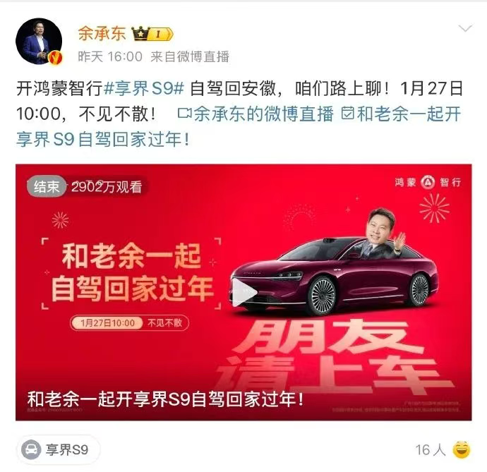 与上述情况相比,华为常务董事余承东的态度变化更具象征意义。2024年12月,余承东下单了一台享界S9 Ultra长续航版本。随后的2025年春节,余承东开着这辆享界S9自驾回安徽老家,并开启了直播。