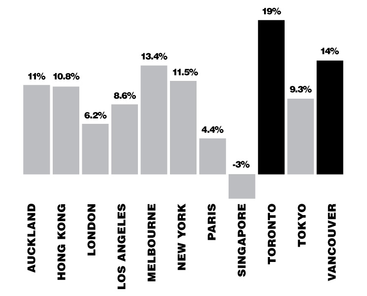 然而根据悉尼《星期六电讯报》报道,由CoreLogic进行的全球房地产分析显示则给了所有加拿大人一个大大的下马威。该报告指出,温哥华的房价一直以发达国家第三高的速度上涨,涨幅高达14%,而同样位于加拿大的多伦多更是排名第二,为19%。位于榜首的是新西兰的奥克兰,2014年到2015年奢侈房地产市场增加64%,为全球增速最快。报告显示,虽然悉尼的中位数房价在过去一年上涨了18.4%,但纽约的年均增长率为11.5%,伦敦的增长率为6.2%。