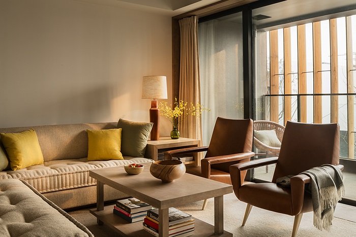 72 间湖景套房里,原生态的木质地板和家具让空间氛围更加温馨。手工编织地毯、埃及棉、水晶和盐晶灯都会让睡眠更为舒适,这也是专为参加养生课程的客人准备的下塔处。房间迷你吧里贴心准备了早、午、晚安茶包,饮用水是玻璃瓶装的蒸馏水,PM 2.5 空气过滤设备也都备齐,并配上品牌自己的 8 by Octave 洗护系列,细节上照顾得很周到。