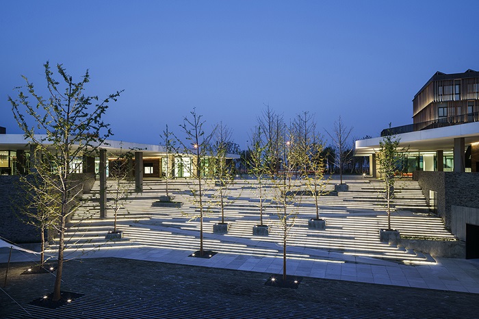 熟悉音昱这个品牌的应该知道,在上海建国西路有个名叫“音昱听堂”的健康中心,而阳澄湖的“音昱水中天”则是它的升级版。整个项目由由世界级建筑设计师曹慰祖先生携手“中国现代主义建筑之父”张永和先生,以及“如恩设计研究室”创始合伙人郭锡恩先生、胡如珊女士共同规划打造。耗资 35 亿,不为建房而凿石,坚持使用可再生的环保材料,比如带着痕迹的青砖以及有原生文理的火山石等,摈弃了大理石、花岗岩等不少豪华酒店中必备的华丽元素,让建筑整体呈现出舒适的色调。