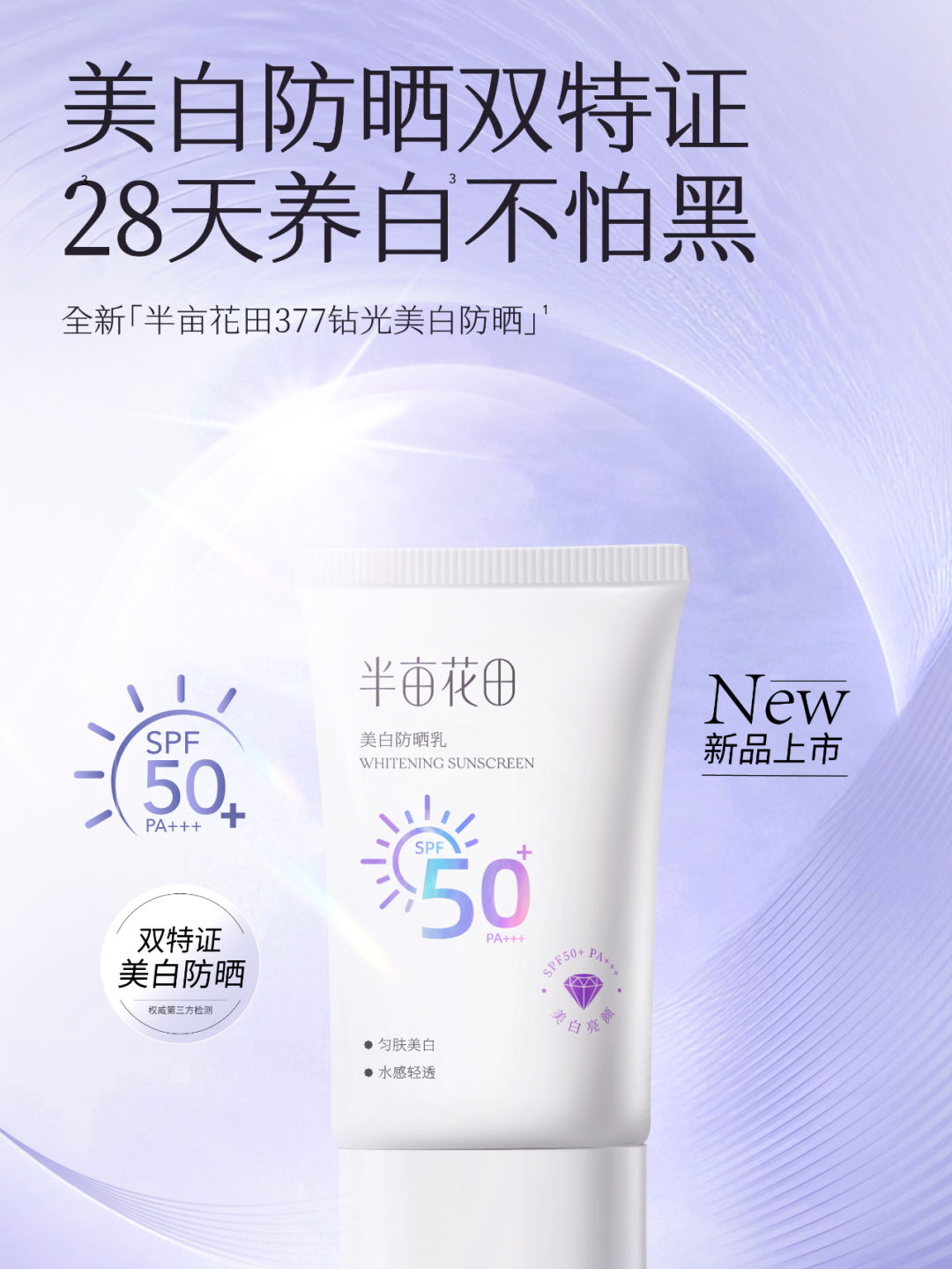 为做到低渗透性,在皮肤不平整的地方也可均匀成膜,半亩花田全新“377钻光美白防晒”则运用了“低密成膜防晒技术”;同时通过7重有机防晒体系,达到全波段高效防晒,预防晒伤、晒黑、晒斑、晒老化。