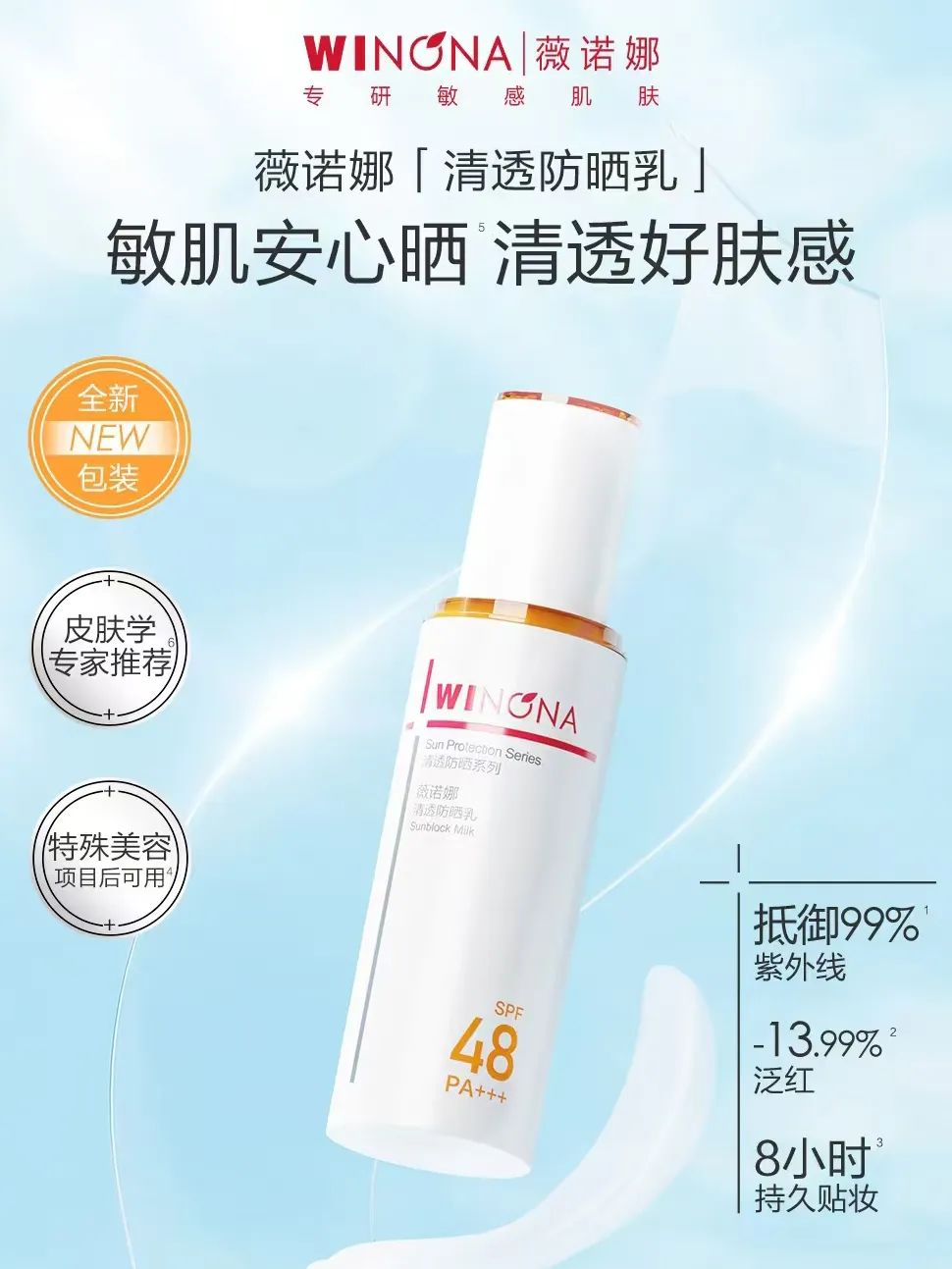 薇诺娜近期以“敏肌安心晒,清透好肤感”为核心对十年经典防晒大单品清透防晒乳进行了全新升级。通过核心的植物科技成分对应肌肤靶点做到精准修护,抑制4大光敏因子,实现从表皮层至真皮层全面修护。清透防晒乳打头阵,主打外防内养的全新“时光防晒”也同步上市,满足敏肌抗老、防晒需求一步到位,成为全新防晒高浓抗皱好搭档。
