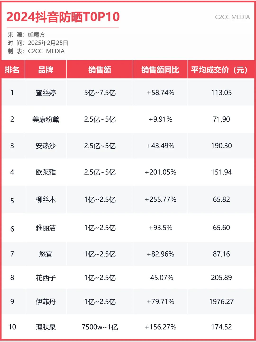 其中美康粉黛防晒GMV超4亿元,成为2024年度抖音防晒产品GMV排名第一的国货品牌。柳丝木、雅丽洁、unny club、花西子均入榜抖音防晒TOP10。