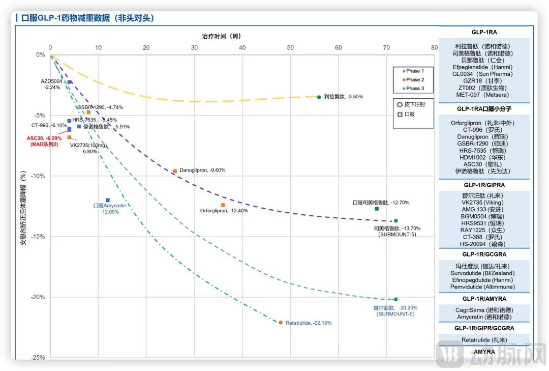 德睿智药的MDR-001,其1b/2a期试验结果显示受试者在经过12周治疗后,安慰剂扣除后受试者平均体重下降6.9%(礼来7.9%)。此外,闻泰医药的VCT-220虽然没有公布数据,但其在2024年底已经展开减重的临床3期试验。