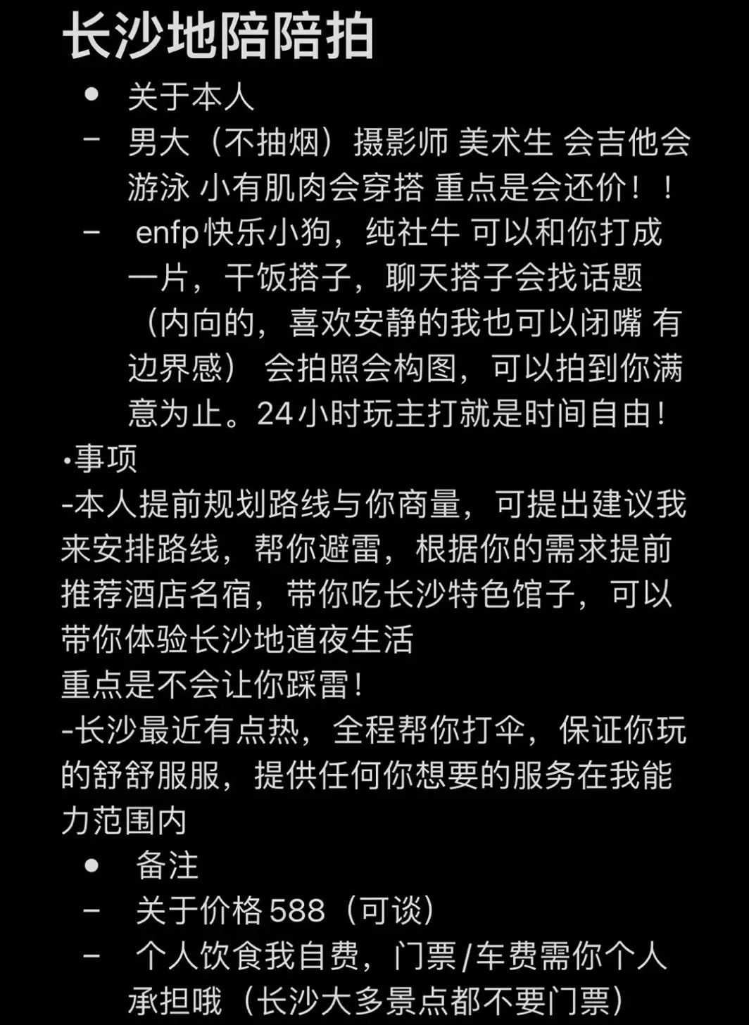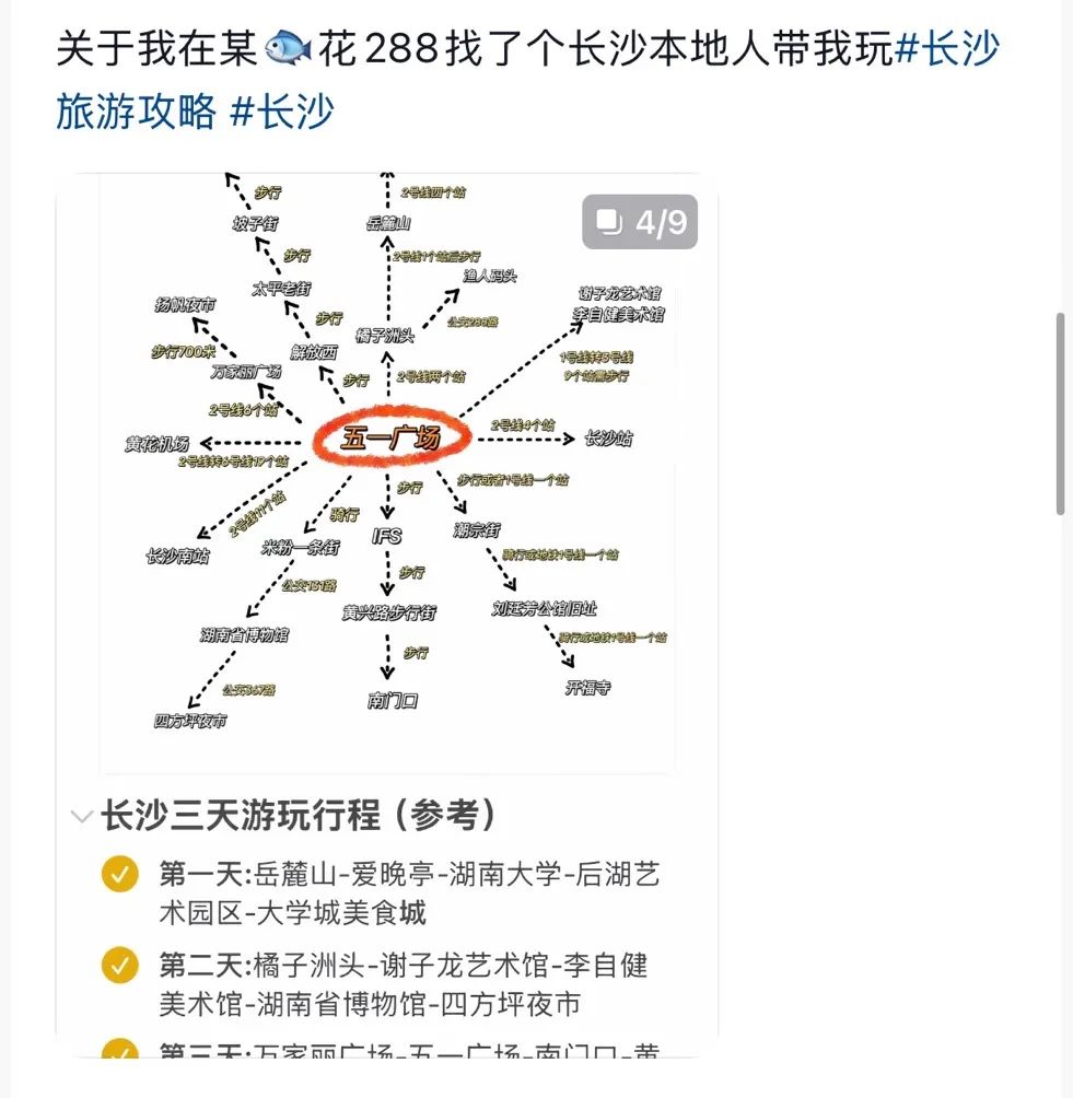 找地陪就是买一份旅游体验的保险。他们即便不提供特别的路线,至少也能过滤掉那些货不对版的地点、门店,保证旅游体验在及格线以上。郑昊告诉硬糖君,橘子洲头这样的打卡点总是人满为患,游客没办法提前踩点找到出片位置,“我们经常去这些地方,哪里光线充足、哪里背景干净,早就摸得一清二楚,包出大片的。”