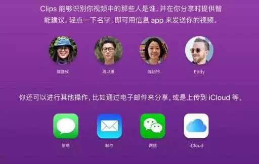 Clips 制作的视频支持上传至 iCloud,直接跳转分享至微信、Instagram、Facebook、WhatsApp 等热门社交平台,苹果官方还表示 Clips 可以自动识别视频中出现的人,在分享时提供智能建议。