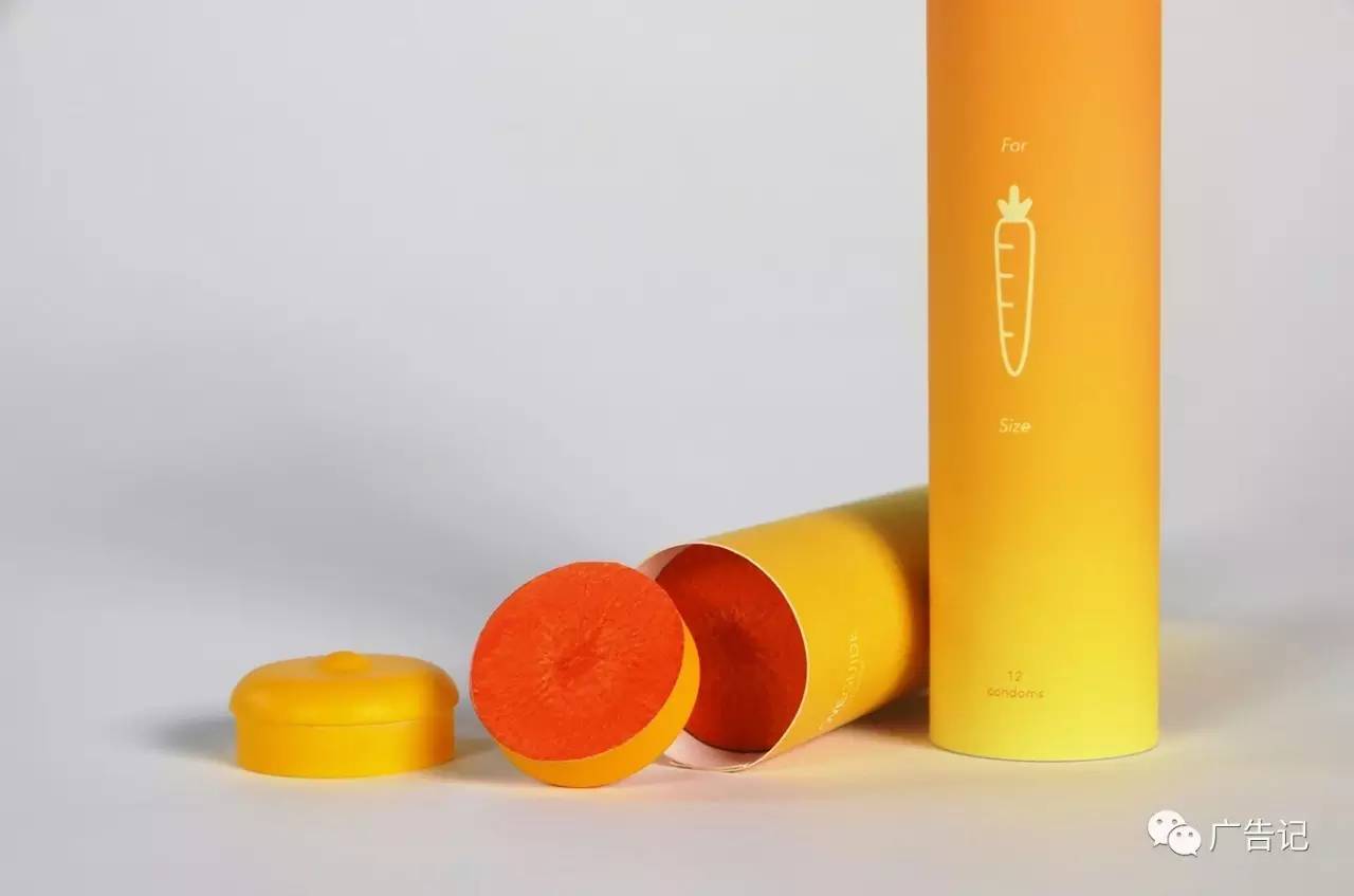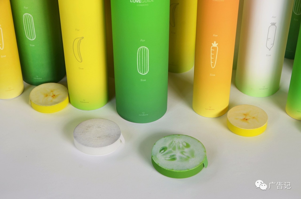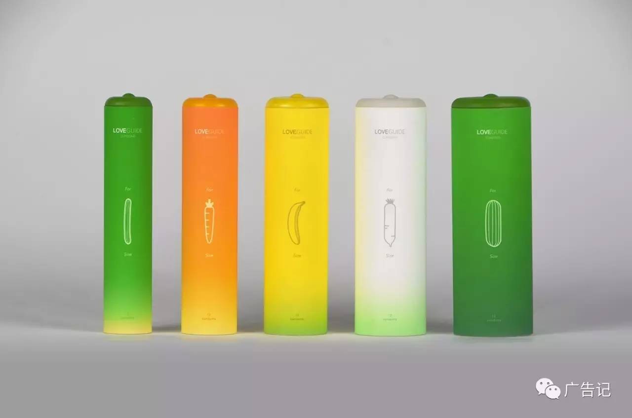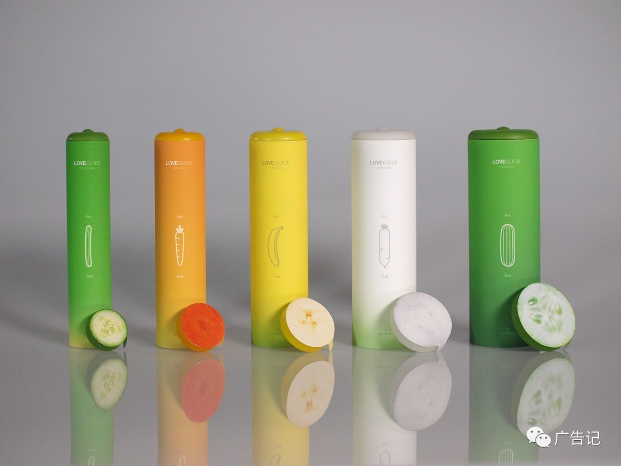 他根据不同的安全套直径,设计出了5种直径的包装盒,并分别用不同的蔬菜(水果)来展示,包括:西葫芦(直径50mm)、萝卜(45mm)、香蕉(40mm)、胡萝卜(35mm)、黄瓜(30mm)。