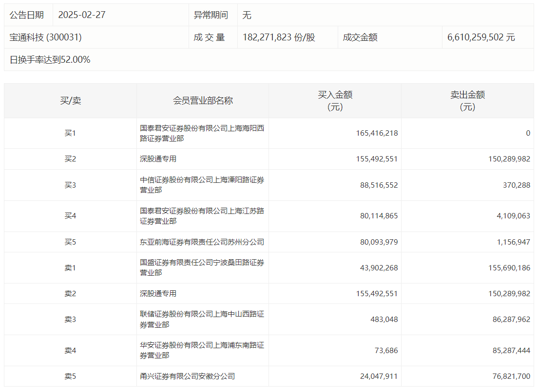 具体来看,知名游资现身龙虎榜,国泰君安证券上海海阳西路证券营业部、深股通专用分别买入1.65亿元、1.55亿元;宁波桑田路(国盛证券宁波桑田路证券营业部)、深股通专用分别卖出1.56亿元、1.50亿元。