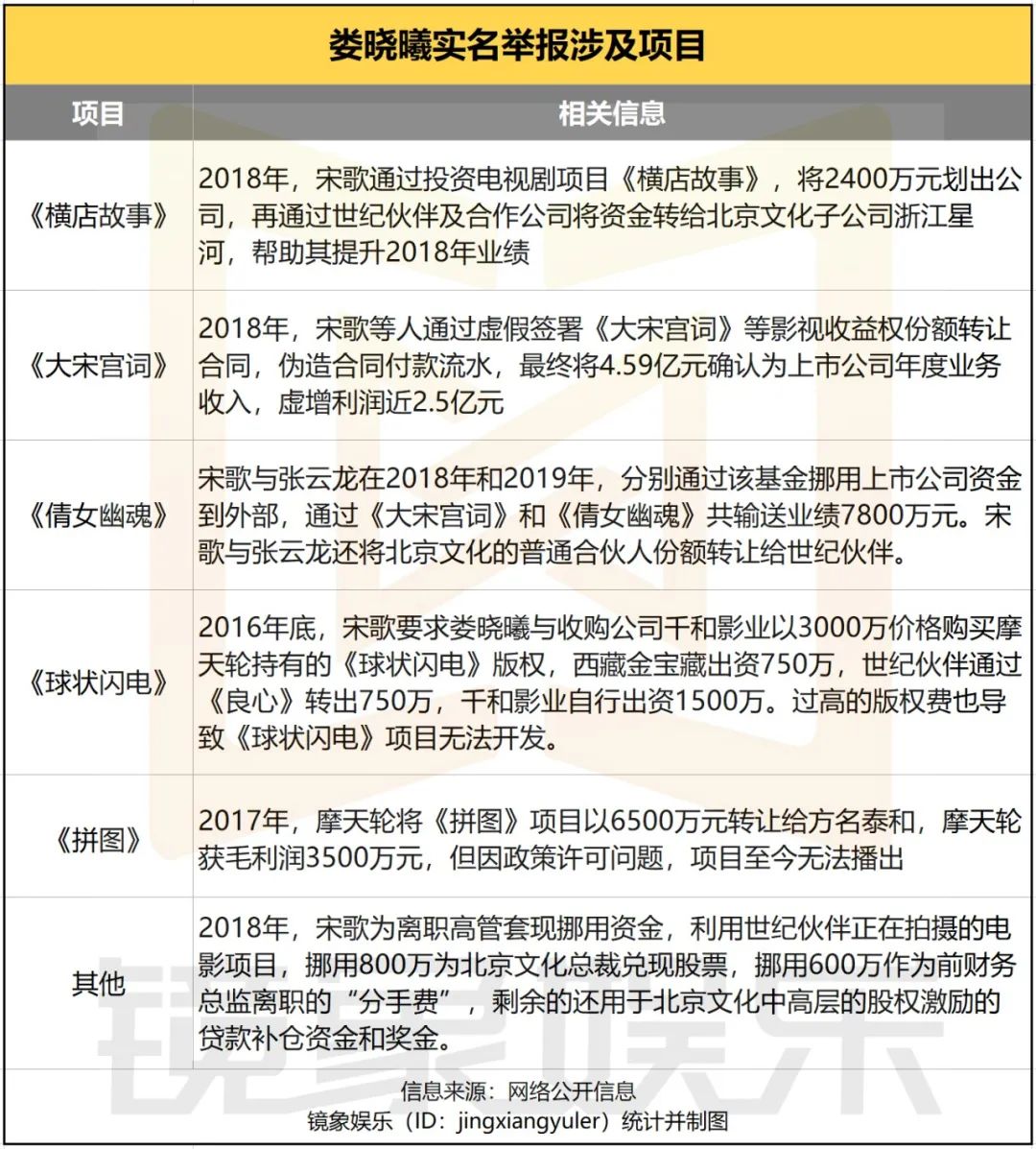 财报披露当晚,娄晓曦便在微博实名举报宋歌财务造假,涉及《球状闪电》《大宋宫词》《倩女幽魂》等多个项目。其中,《倩女幽魂》还牵扯出郑爽偷逃税事件,经国家税务总局查明,北京文化涉嫌协助郑爽通过拆分合同,隐瞒《倩女幽魂》1.6亿元片酬偷税,导致郑爽被罚2.99亿元。
