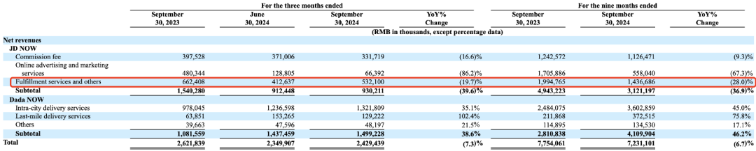 达达财报包含两块收入,京东秒送和达达秒送(给第三方商家和个人配送)。2024年2月以来,京东秒送推出满29元减免配送费的策略,已经牺牲了达达的配送收入。据达达财报显示,2024年前三季度,京东秒送业务的收入同比下滑36.9%,其中履约服务和其他收入下滑28%。京东外卖将继续增加达达的负担。