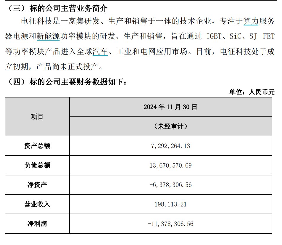 财务情况方面,电征科技净资产为-637.83万元,截至2024年11月30日的营收为19.81万元,净利润为-1137.83万元。