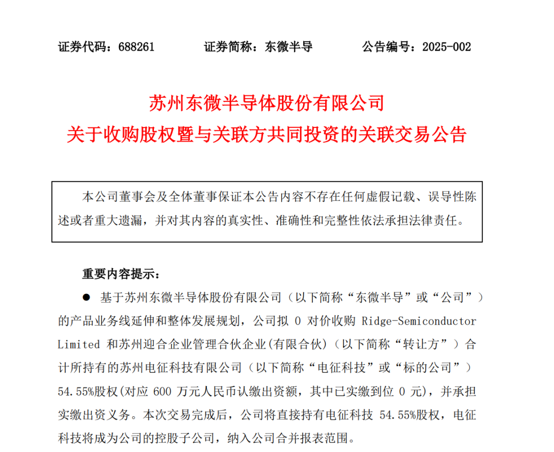 一个多月前,东微半导宣布了一起收购,交易对价是0元,颇受市场关注。