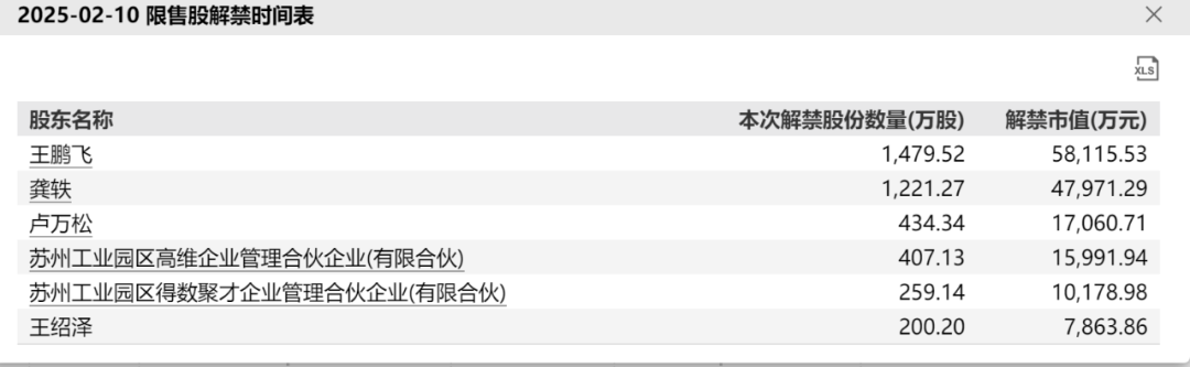 其余解禁股份为苏州工业园区得数聚才企业管理合伙企业(有限合伙)、苏州工业园区高维企业管理合伙企业(有限合伙)持有,共计666.27万股,占该公司总股本的比例为5.44%。