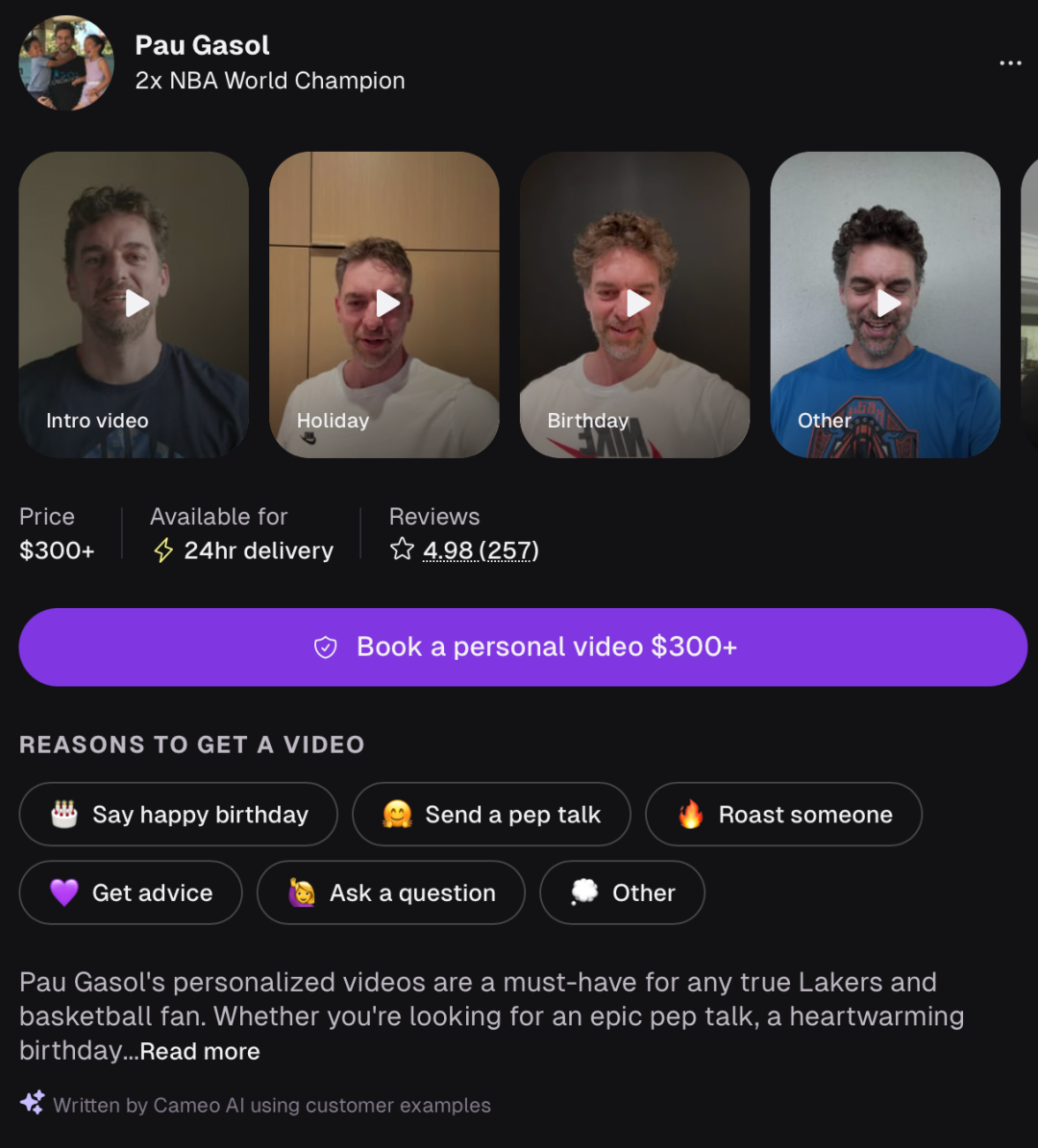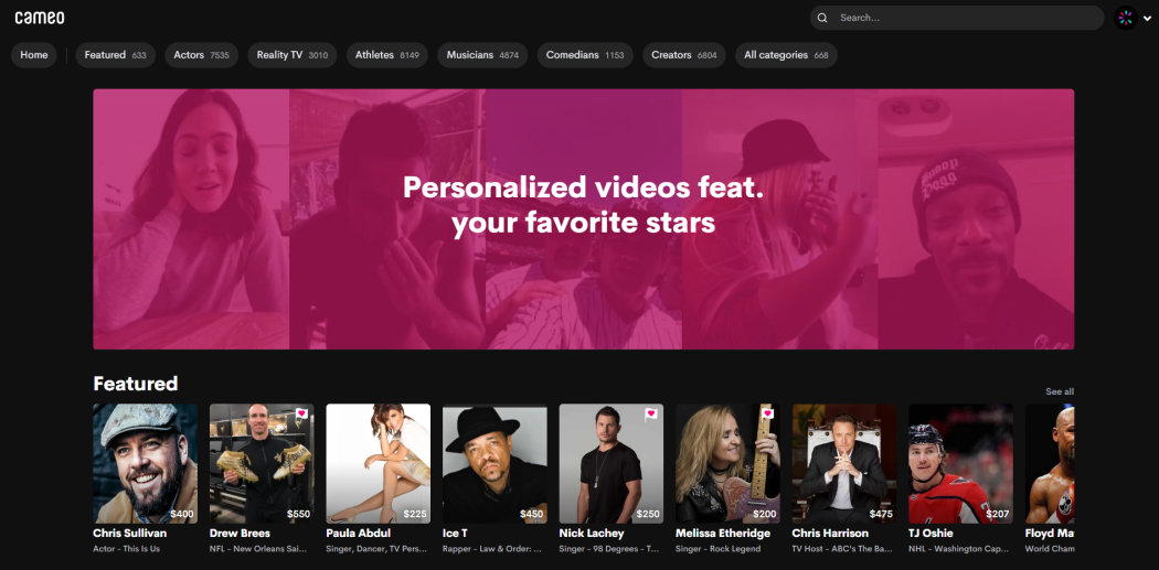 截至2023年,在平台上注册「接单」的名人已经超过五万人,涵盖的类别非常广泛,从各大联赛的球星到好莱坞演员,都在Cameo上以5到3000美元的价格出售自己的定制服务。