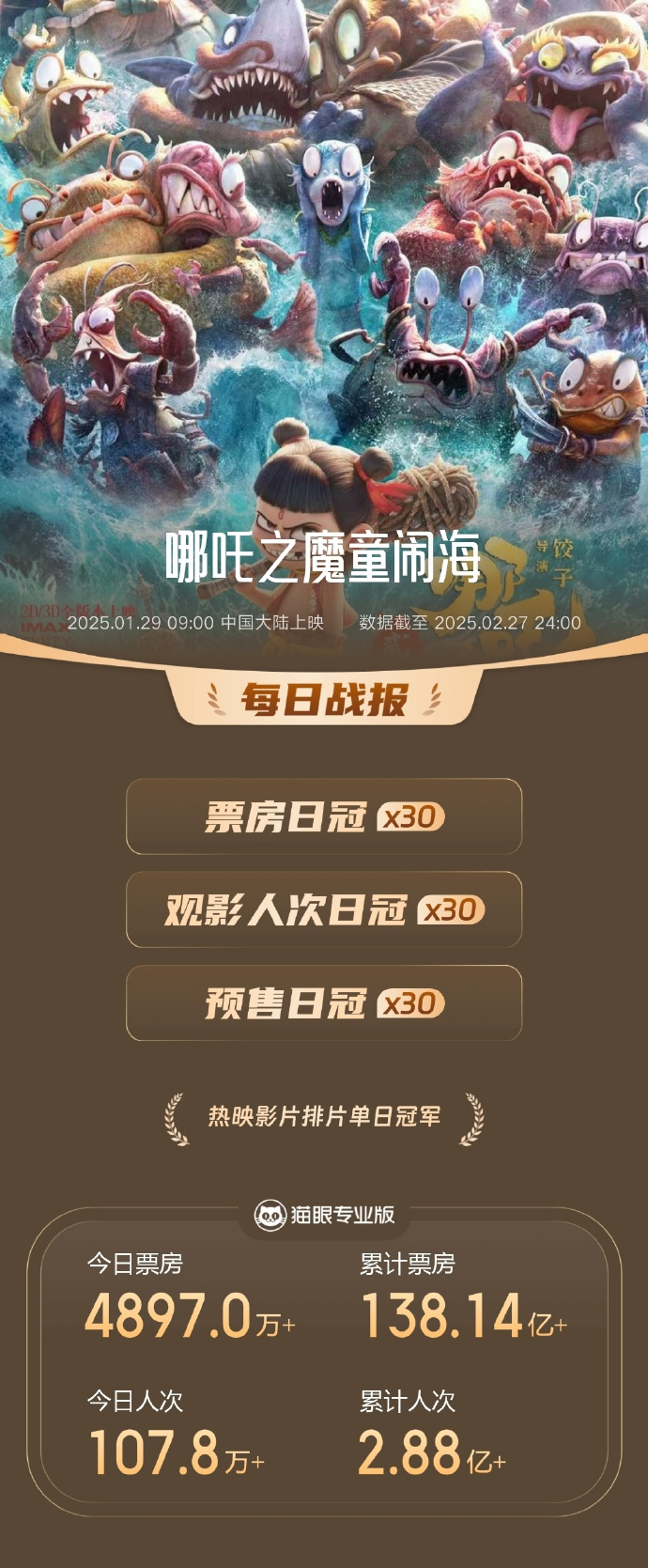 据猫眼专业版数据,截至2月27日,电影《哪吒之魔童闹海》上映30天,连续30天获得单日票房冠军。