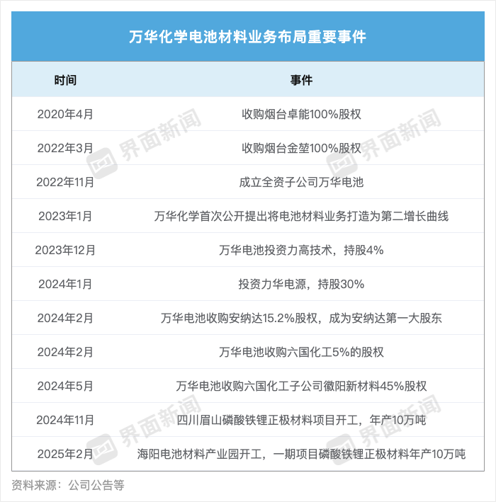 除磷酸铁锂产能建设外,万华化学也通过收购兼并,实现正极材料的全产业链布局。