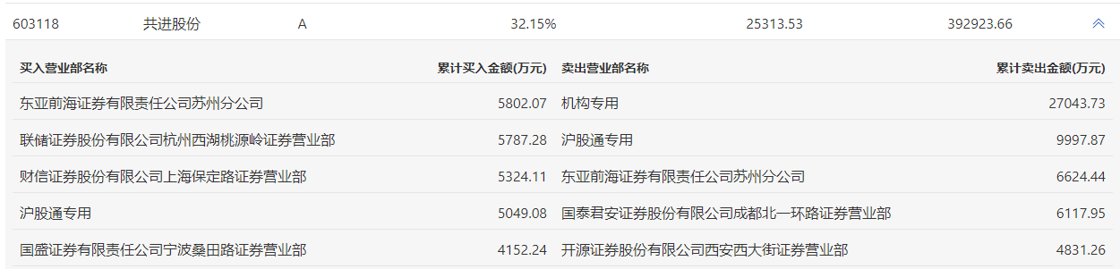 共进股份2月28日跌4.30%,成交额39.29亿元,换手率32.15%,盘后龙虎榜数据显示,沪股通专用席位买入5049.08万元并卖出9997.87万元,一机构专用席位净卖出2.70亿元。