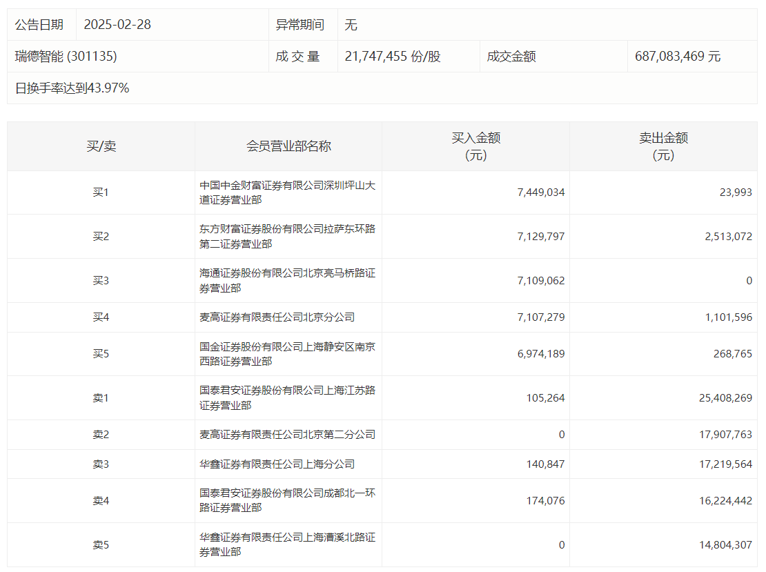 瑞德智能今日跌8.5%,龙虎榜数据显示,上榜营业部席位全天成交1.32亿元,占当日总成交金额比例为19.16%。其中,买入金额为3618.95万元,卖出金额为9547.18万元,合计净卖出5928.22万元。