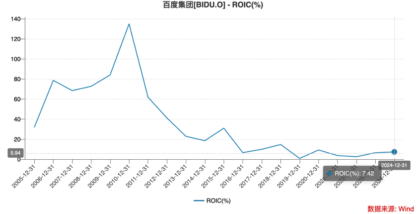 由于当前百度正处于新旧业态的切换期,基石的营销收入已显疲态,市场被寄予厚望的AI业务在财务报表中尚未有太大斩获,这让百度的ROIC变得非常尴尬,过去几年基本处于连续的下行周期。