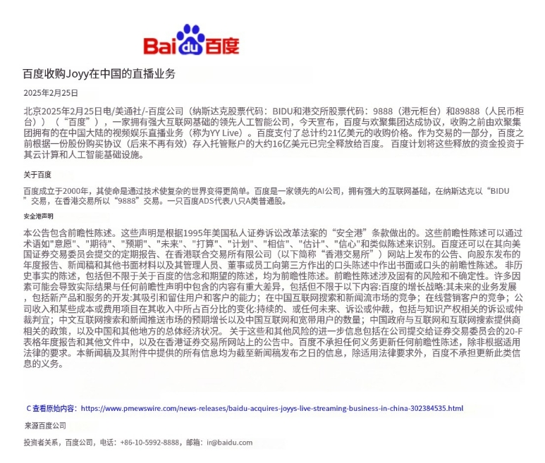 2月25日,百度发布公告称,百度与欢聚集团订立协议并收购先前由JOYY拥有的中国内地视频娱乐直播业务(即YY直播)。百度已支付总收购价约21亿美元(约合人民币152亿元)。