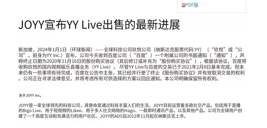 到了2024年1月,百度正式发布公告,宣布将终止对YY直播的股权收购协议。