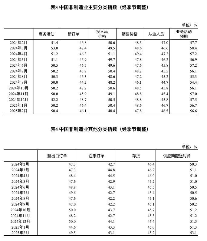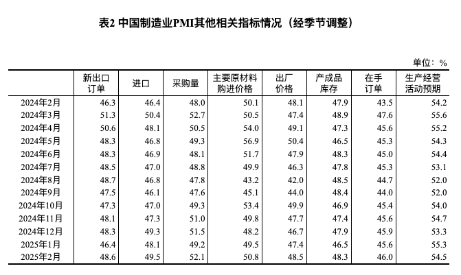 生产指数为52.5%,比上月上升2.7个百分点,表明制造业企业春节后生产活动较快恢复。