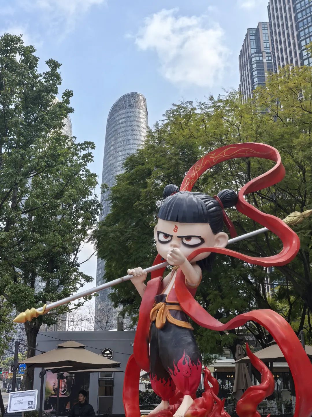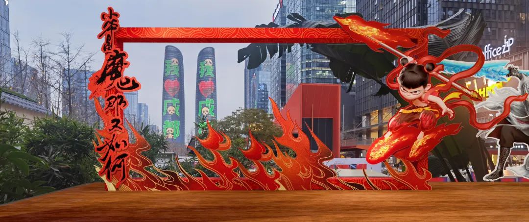 值得一提的是,现场还打造了哪吒主题人物、天府双塔合影区,还有交子大道人气景点——“6米哪吒塑像”,10余个IP主题人物结合形象特点进行二创呈现,全方位体验交子大道国漫氛围,出片率100%。