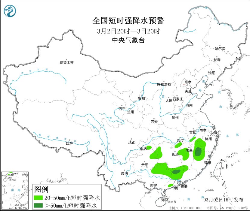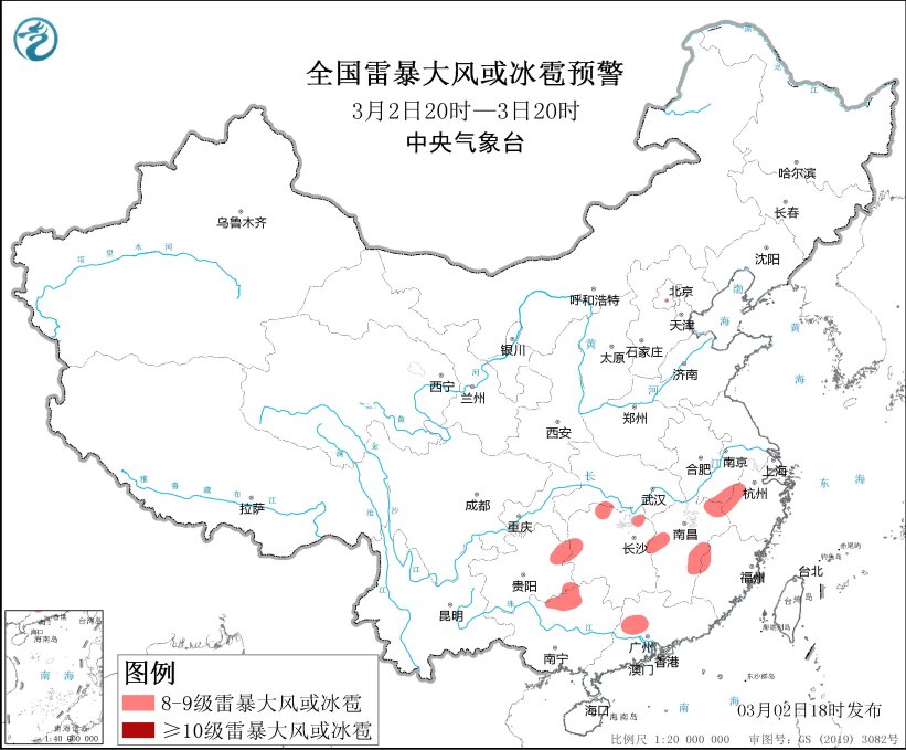 预计3月2日20时至3日20时,贵州东部、广西北部、湖南北部、安徽南部、江西中东部、浙江西部等地的部分地区将有8级以上雷暴大风或冰雹天气,局地风力可达10级;贵州东部、广西北部、湖南北部和南部、江西大部、福建西北部、浙江西部等地的部分地区将有小时雨量大于20毫米的短时强降水天气,其中,广东北部、福建西北部、江西东部等地的部分地区小时雨量大于50毫米。