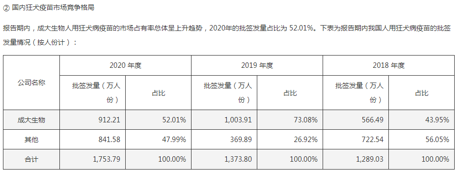 成大生物招股书显示,公司旗下人用狂犬病疫苗的批签发量占比从2018年的43.95%猛升至73.08%。2019年,该公司还以3190万支销量占据全球15.5%的最大份额,超过赛诺菲等国外疫苗生产商,位居全球第一。