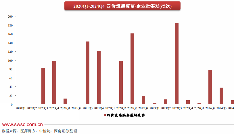 2024年,我国流感疫苗批签发303批次,同比下降11%;其中,四价流感疫苗获批签发166批次,同比减少36%。
