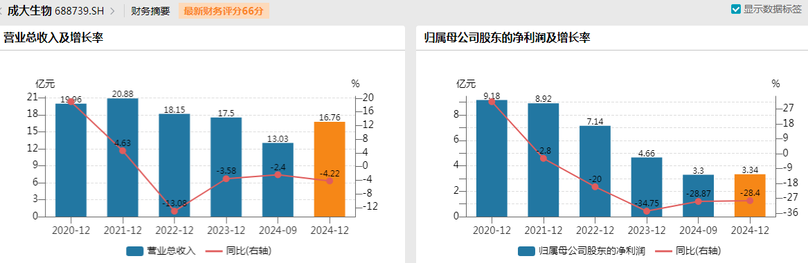 狂犬病疫苗龙头成大生物(688739.SH)近日披露业绩快报。2024年,公司实现营业收入16.76亿元,同比下滑4.22%;实现归母净利润3.34亿元,同比降低28.4%。
