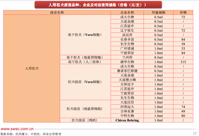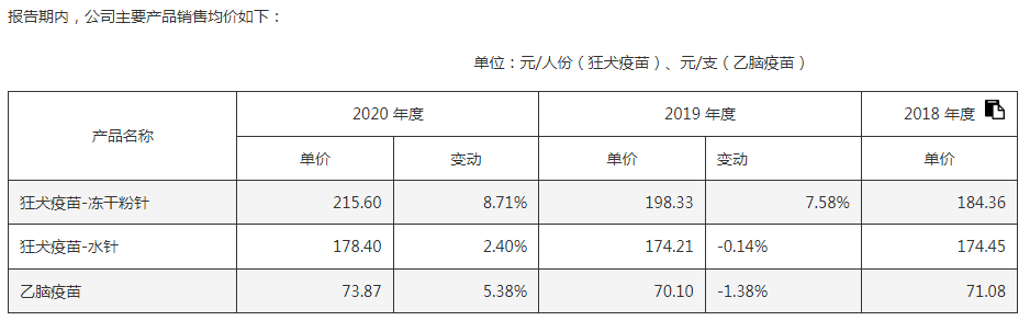 成大生物招股书显示,2018年至2020年,该公司旗下冻干人用狂犬疫苗产品单价分别是184.36元/人份、198.33元/人份、215.6元/人份。界面新闻查询“约苗”小程序看到,目前成大生物相关狂犬病疫苗单价在70元至130元之间。西南证券研报显示,0.5ml用量规格的成大生物人用狂犬疫苗单价是72元/支。