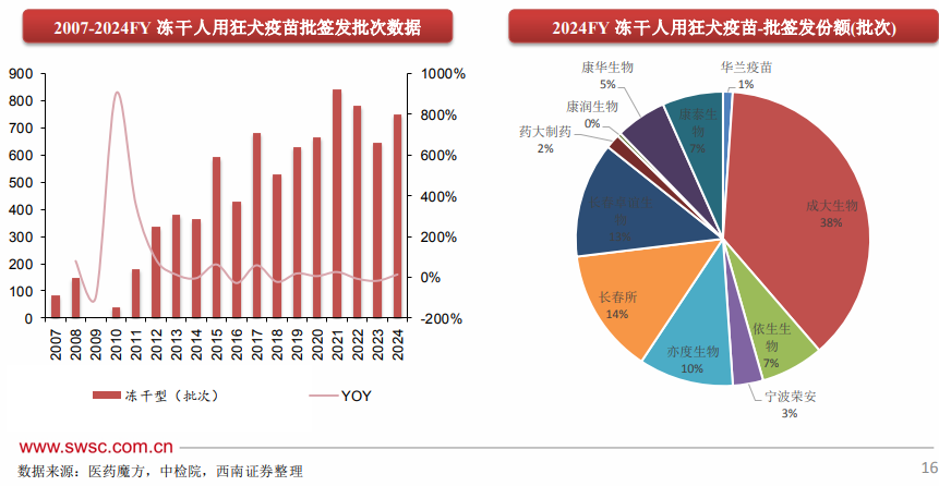 然而,如今市场竞争格局已变,已有超10家国内疫苗生产企业的人用狂犬病疫苗获得中检院的批签发。据Frost&Sullivan统计,截至2025年1月,中国有23种已上市人用狂犬病疫苗;另有19种处于临床开发阶段的在研人用狂犬病疫苗。